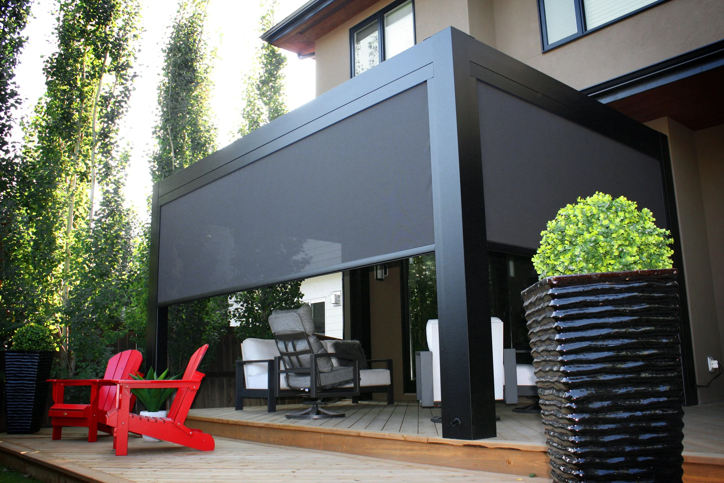 Whether you want to create an outdoor experience, complement a luxurious poolside area, or relax in your outdoor courtyard, a retractable louvered pergola creates an inviting, modern and adaptable space to enjoy with your loved ones all year round. With a range of designs and custom sizing available, your pergola is adaptable to any outdoor space. Durable free-standing designs can accentuate your outdoor dining or pool/hot-tub area, while a fixed design can provide an outdoor extension to your home, increasing its value and unlocking livability.